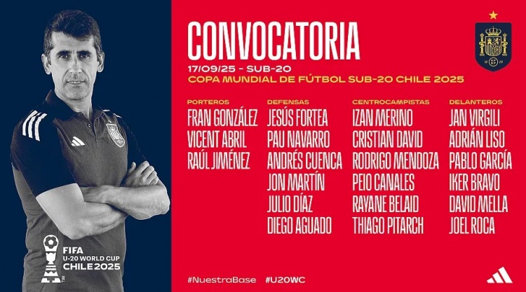 西班牙足协在官网写道:“西班牙U20国家队即将出征智利世界杯,21名年轻球员将肩负荣誉与梦想,迎接这一全球最负盛名的青年足球赛事。主教练帕科-加拉尔多在周三公布了参赛名单,球队将于9月22日启程,以最佳状态迎接比赛的到来。”