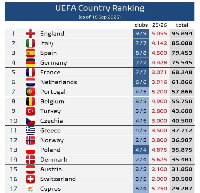 9月19日讯 欧冠联赛阶段首轮已经完赛,相关机构也统计了本赛季的欧战积分情况,并更新了欧足联旗下各协会的积分排名。英格兰依然独自领跑,而意大利第二的位置仍暂时牢固,但领先优势有略微缩小。